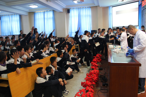在校園,青海鹽湖所的博士科普?qǐng)F(tuán)隊(duì)為中學(xué)生們講述了鹽湖故事,在《中國的鹽湖》科普講座中,形象生動(dòng)地講述了“什么是鹽湖”“鹽湖在哪里”“鹽湖里有什么用”,使同學(xué)們對(duì)青海的特色優(yōu)勢鹽湖資源有了初步的認(rèn)識(shí);開展了神奇的化學(xué)小實(shí)驗(yàn),通過多彩化學(xué)、密碼顯形、黃金雨、催化放氧、銅樹銀枝、銀鏡反應(yīng)等一系列精彩的科普實(shí)驗(yàn),緊緊抓住“變化”這一核心,以極具震撼力的方式向同學(xué)們展示了化學(xué)之美和科學(xué)之美,為同學(xué)們開啟科學(xué)世界的大門,激起他們探索科學(xué)世界的興趣;醫(yī)療專家為同學(xué)們現(xiàn)場普及家庭急救知識(shí)和新冠疫情預(yù)防知識(shí),現(xiàn)場演示了心肺復(fù)蘇方法、正確的洗手方法及注意事項(xiàng)。無論是小實(shí)驗(yàn)還是急救現(xiàn)場演示,同學(xué)們踴躍主動(dòng),興致勃勃,教室里不時(shí)發(fā)出陣陣驚嘆聲和掌聲,活動(dòng)取得了圓滿成功。